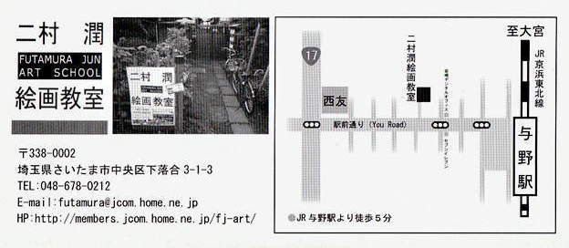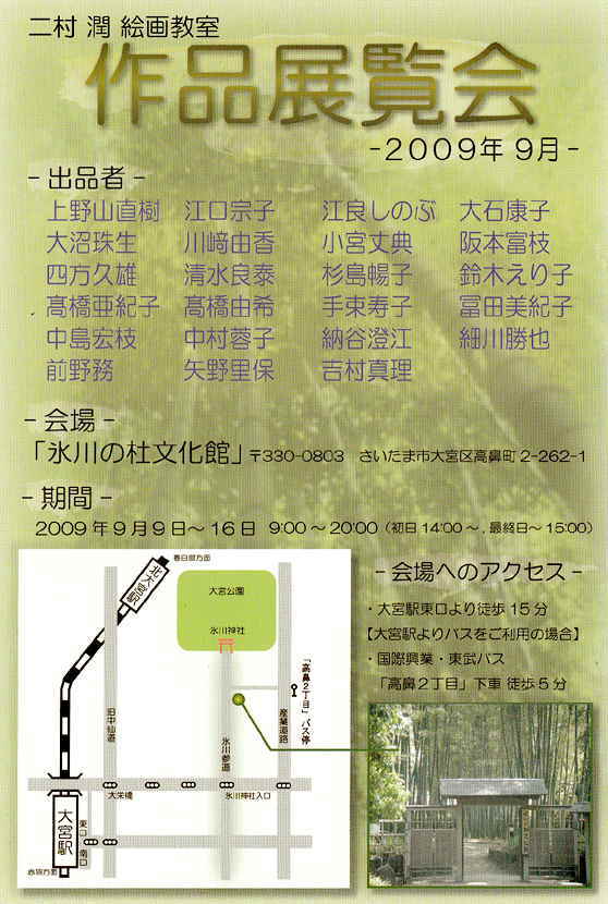 「二村潤絵画教室作品展覧会」 2009年9月9日(水)〜2009年9月16日(水) 氷川の杜文化館 9:00〜20:00/初日9:00〜 最終日〜15:00 埼玉・大宮「氷川の杜文化館」にて(計23名)作品展覧会を開催! お近くにお越しの際には是非どうぞ、足をお運びくださいませ ************ こちらの案内状(DM)につきましては、教室入口ポスト脇に 教室パンフレットと一緒に置いてございます【自由にお取りくださいませ】 二村潤絵画教室 top