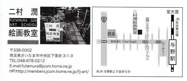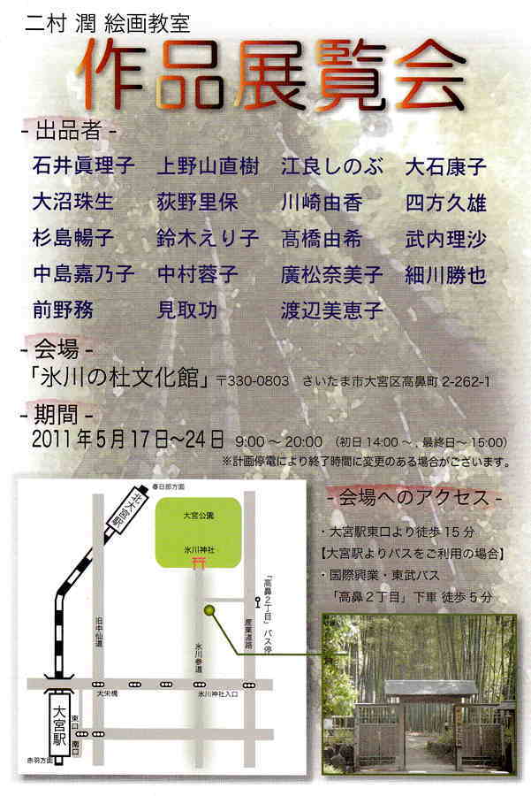 「二村潤絵画教室作品展覧会」 2011年5月17日(火)〜2011年5月24日(火) 氷川の杜文化館 9:00〜20:00/初日:1400〜 最終日〜15:00 埼玉・大宮「氷川の杜文化館」にて(計19名)作品展覧会を開催するまでとなりました 氷川の杜文化館では、昨年6月に続き3回目となります今回の展覧会となります お越しいただきました皆様 誠にありがとうございました! 二村潤絵画教室 top