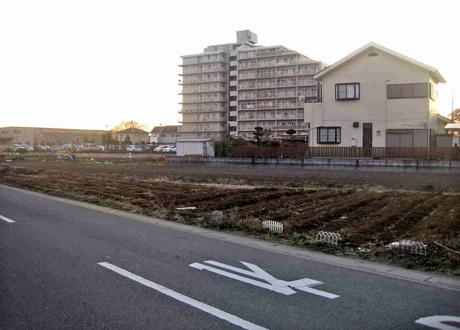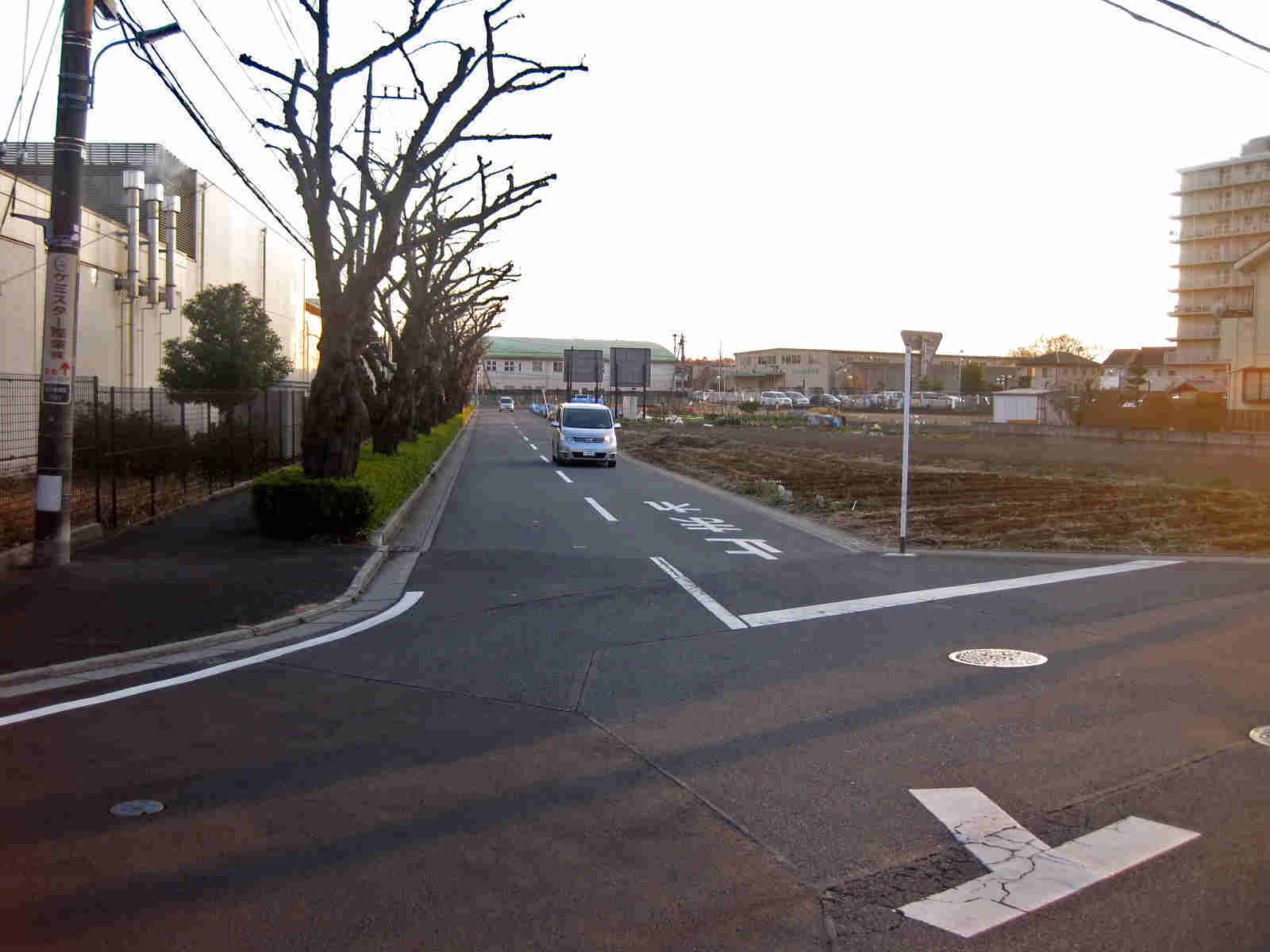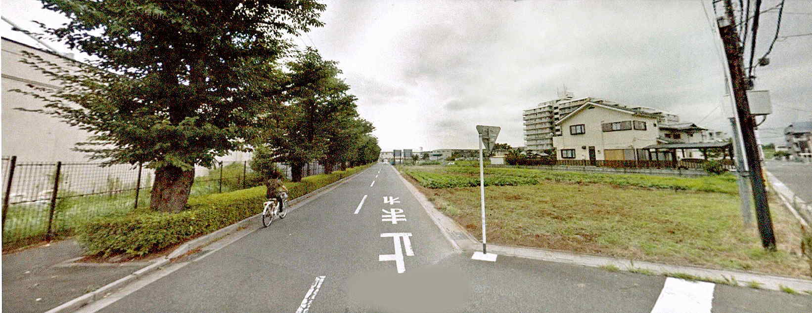 比較的ひらけた大きな道に出ます 道の左側には大きな樹木が立ち並び・・・道の右側には畑などがあり その遠方に大きなマンション