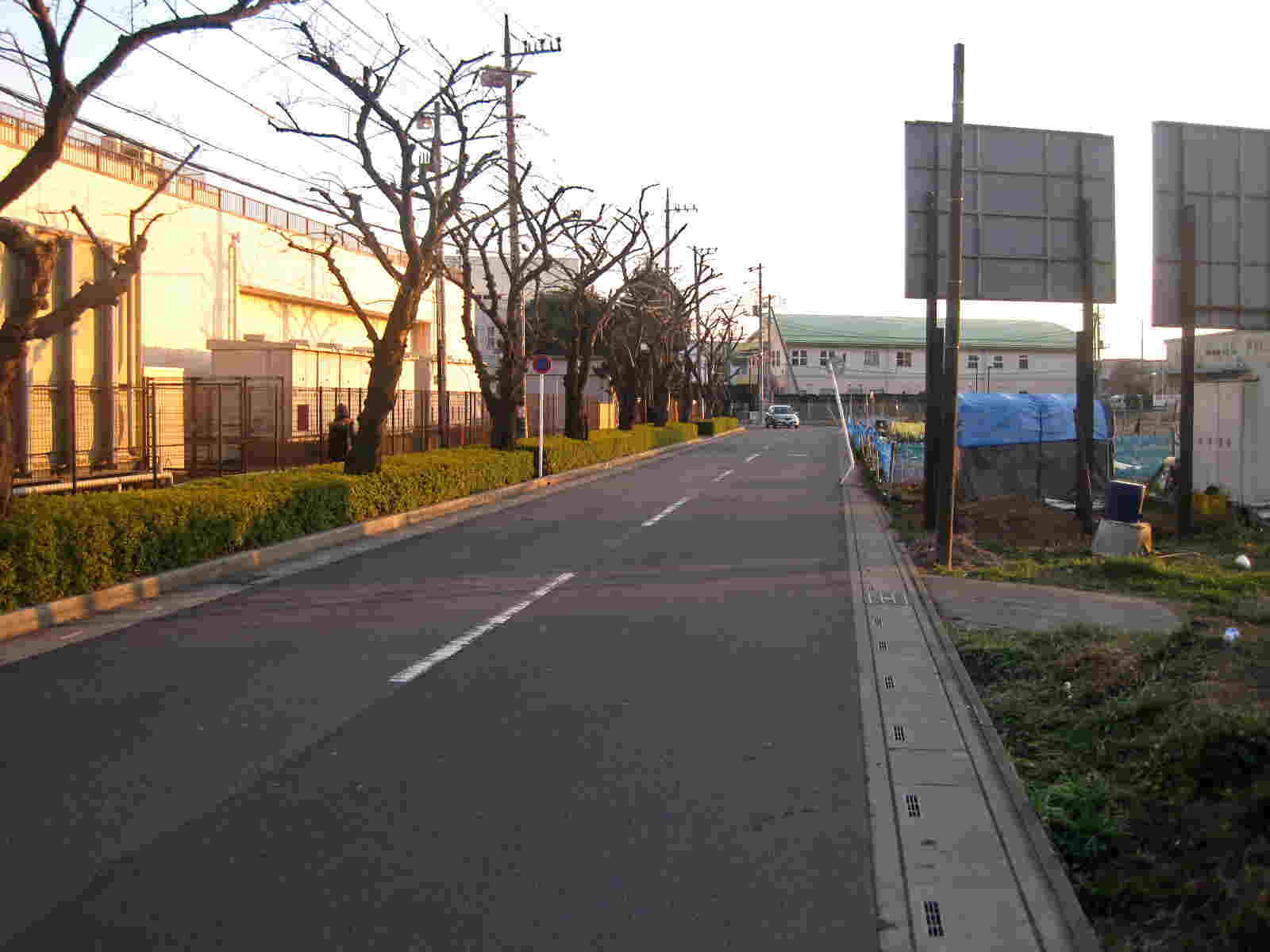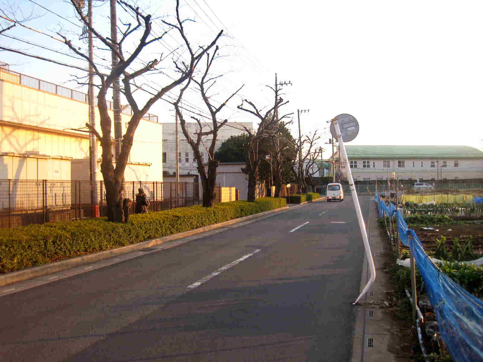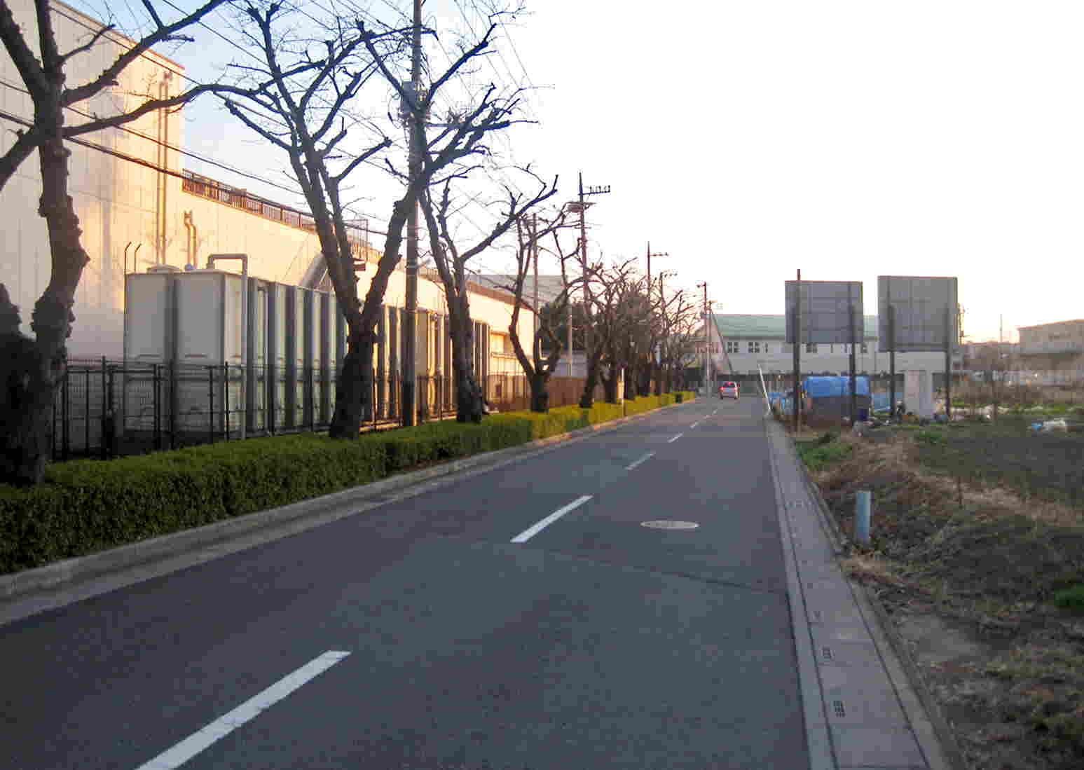 比較的ひらけた大きな道に出ます 道の左側には大きな樹木が立ち並び・・・道の右側には畑などがあり その遠方に大きなマンション
