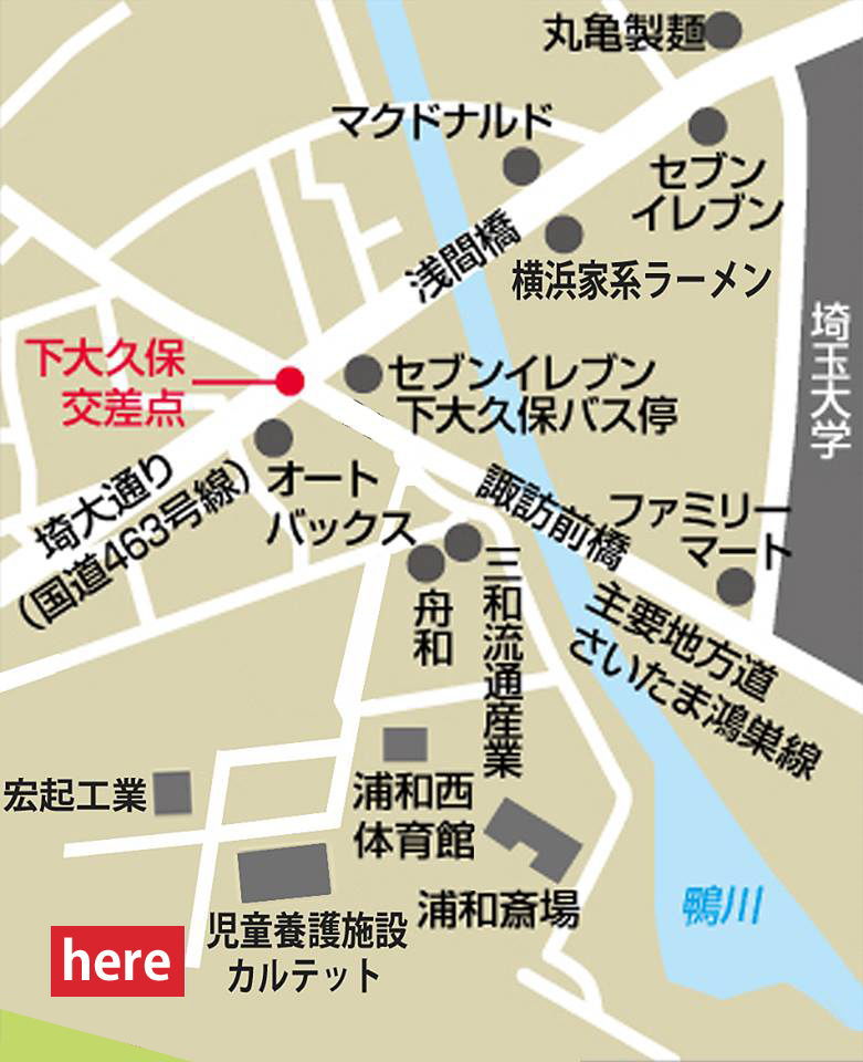 〇JR埼京線:南与野駅 西口より バス:『埼玉大学行き』以外はすべて停車いたします、「下大久保」下車(約12分)