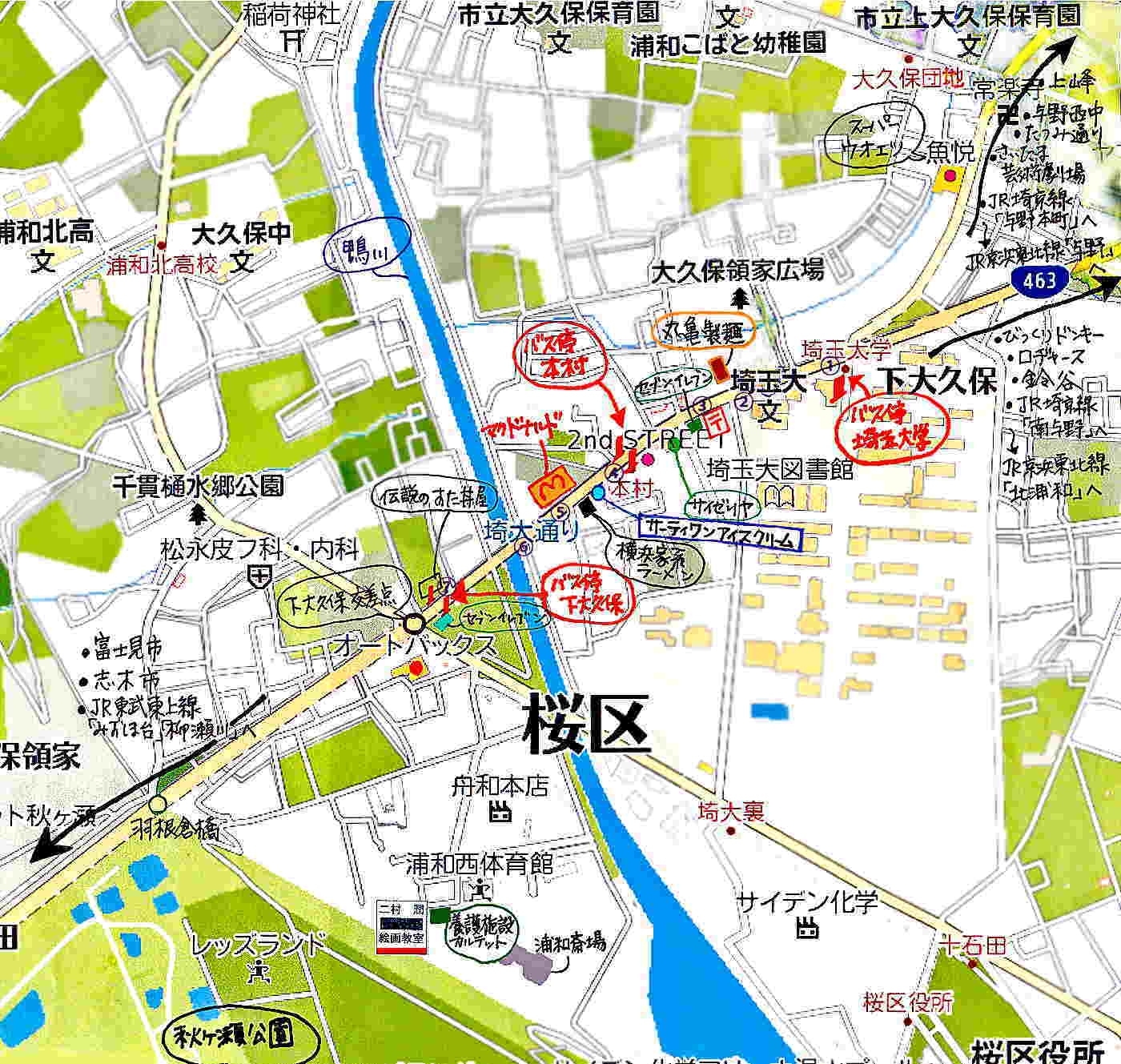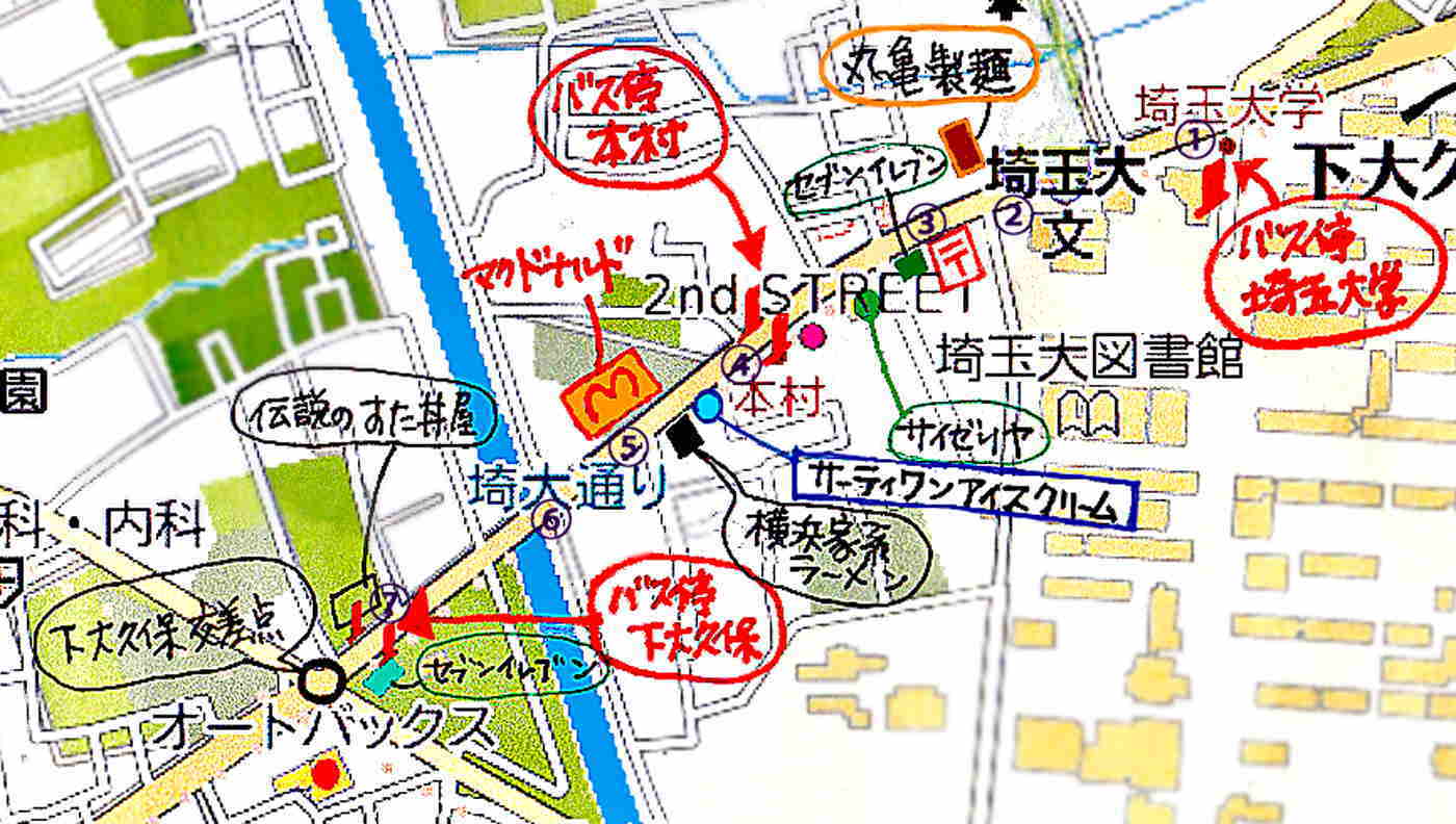 ※そのまま埼大通りを直進するのみとなりまして バス停でいいますと、埼玉大学の次が「本村」で その次が「下大久保」となります