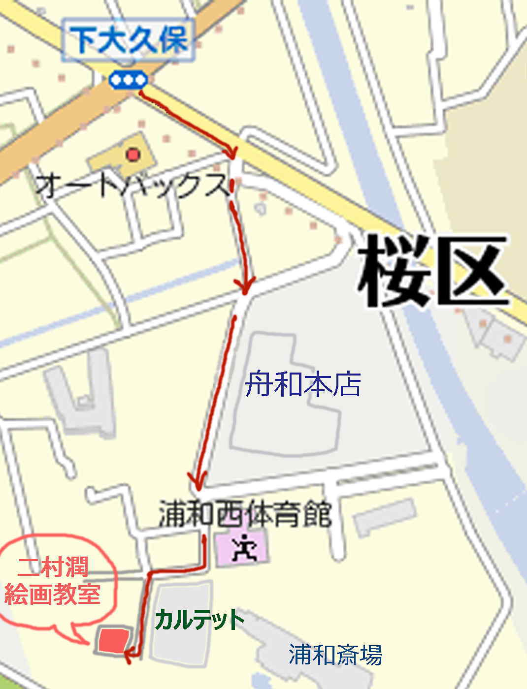 下大久保〜絵画教室までの地図、およびその詳細について